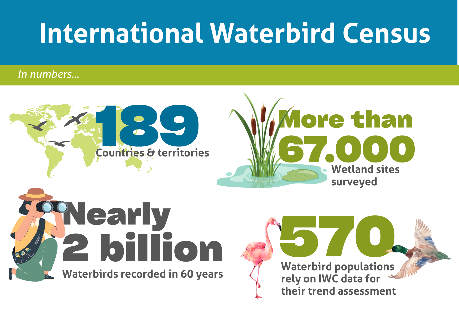 In den letzten sechs Jahrzehnten wurde der IWC in 189 Ländern und Gebieten durchgeführt, wobei Daten von mehr als 67.000 Standorten und über 1,9 Milliarden gezählten Wasservögeln gesammelt wurden. Dieser umfangreiche Datensatz ermöglicht es Naturschützern, echte Populationsveränderungen im Laufe der Zeit zu erkennen, die über kurzfristige Schwankungen hinausgehen.