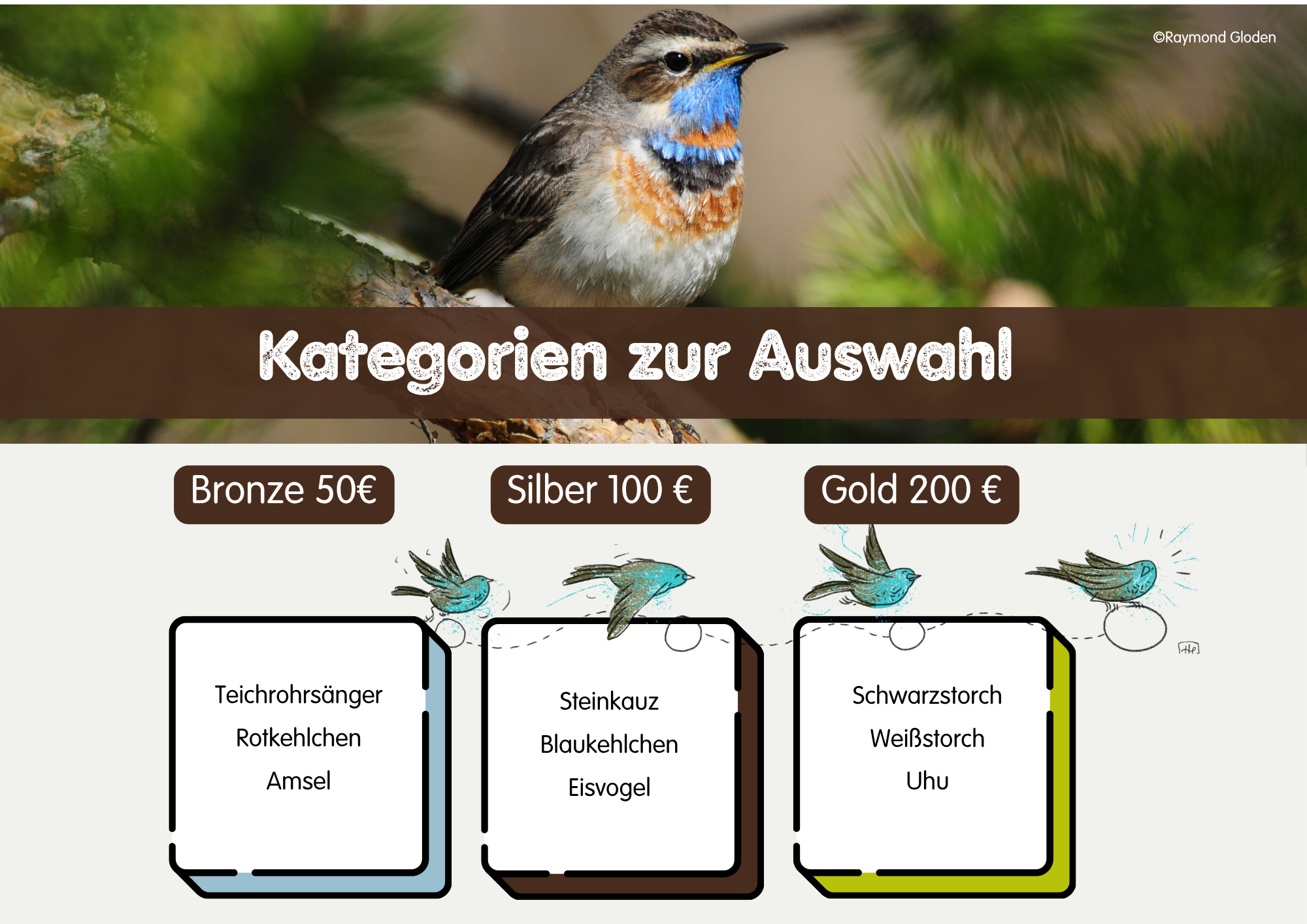 • Ausgewählte Kategorie: BRONZE ou SILBER ou GOLD (Aus praktischen Gründen ist es leider nicht möglich, eine Vogelart innerhalb der Kategorien auszuwählen.)